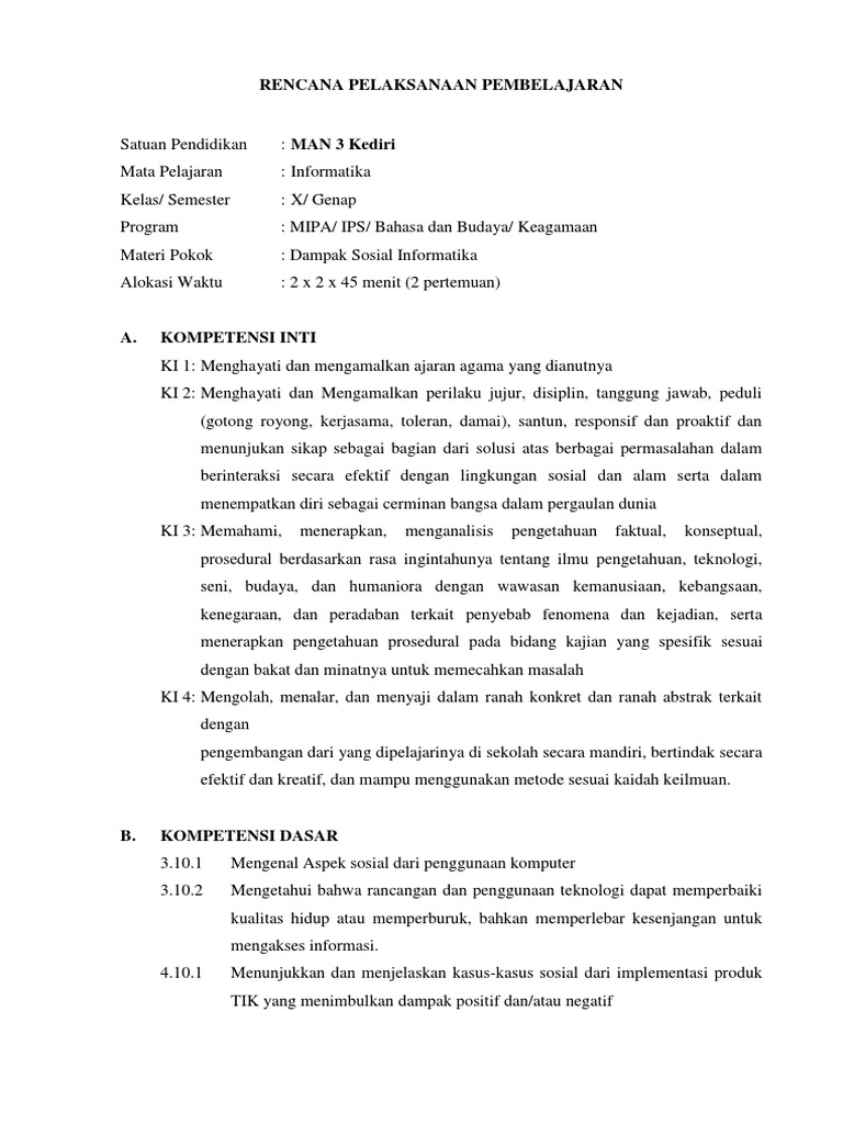 Silabus Informatika Sma 22052019 from imgv2-2-f.scribdassets.com Bapak/ ibu guru dan para pencari file tentang pendidikan juga para sahabat blog pokq.blogspot.com. Seperti kita ketahui bersama bahwa rencana pelaksaan pembelajaran atau rpp merupakan acuan mengajar dari seorang guru didalam. Rpp dan silabus termasuk perangkat pembelajaran yang sangat penting, jika di ibaratkan manusia rpp adalah kakinya. Rpp dibuat oleh guru untuk membantunya dalam mengajar agar sesuai dengan standar kompetensi dan kompetensi dasar pada hari tersebut. Wa 085.218.321.456 | sma > rpp informatika sma kelas x. Selain rpp, dalam paket download berisi juga perangkat pembelajaran secara lengkap Dalam rangka persipan untuk kegiatan pembelajaran pada tahun pelajaran baru tentunya kita sebagai seorang guru harus menyiapkan berbagai k. Rpp bahasa inggris peminatan (lintas minat) kurikulum 2013 revisi kelas x sma, klik disini.